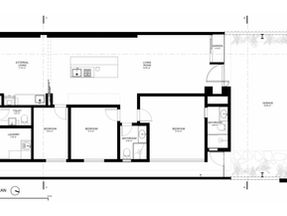 devido às limitações da construção existente, as aberturas para ventilação e iluminação natural foram direcionadas para as fachadas frontal e posterior, deixando as laterais sem possibilidades de abertura. essa restrição foi transformada em um recurso estético e funcional: o concreto da fachada prolonga-se para o interior da casa, estabelecendo uma unidade espacial. assim, mesmo sem aberturas laterais, o interior permanece iluminado e ventilado, com uma atmosfera ampla e arejada. o paisagismo biofílico desempenha um papel fundamental, junto às aberturas limitadas e aos limites físicos, enfatizando a continuidade sensorial.